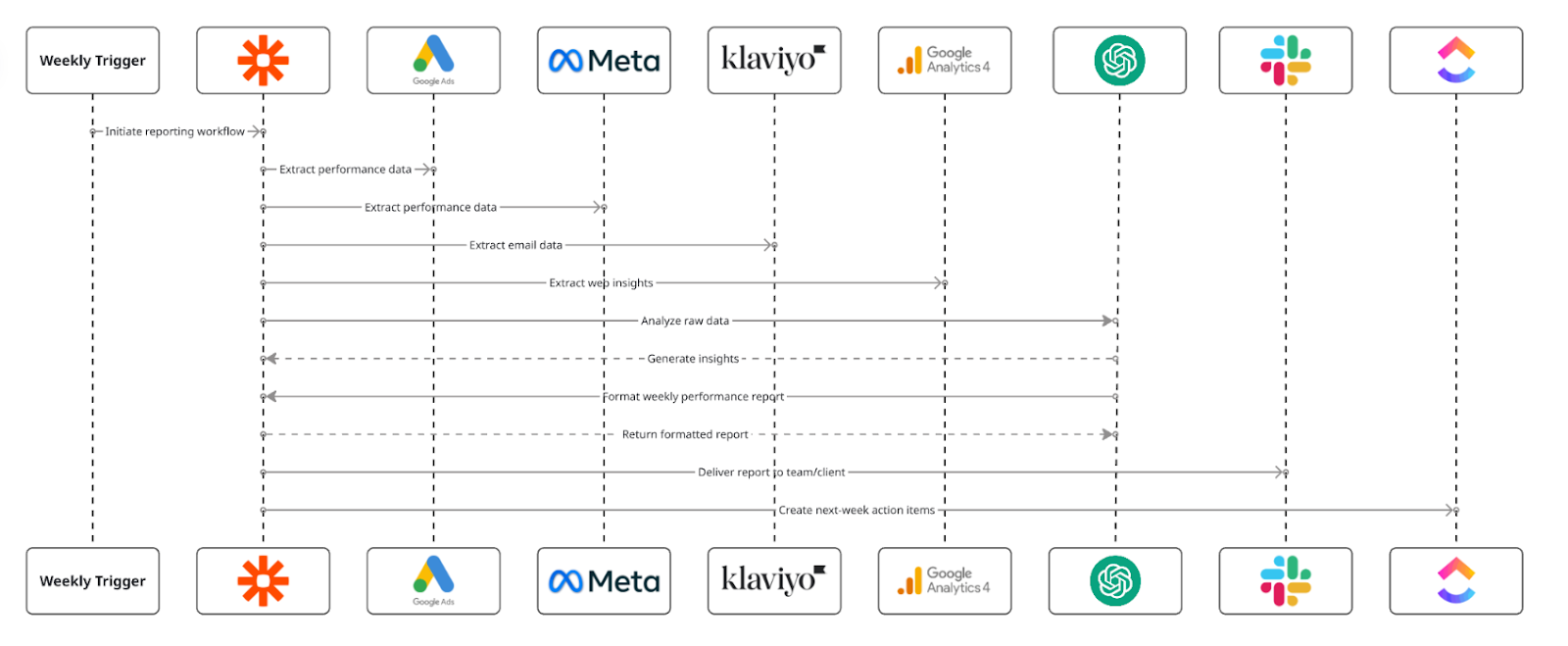 Weekly performance reporting is one of the most repetitive and time-consuming tasks for project managers. Generating reports from multiple platforms—ads dashboards, CRM systems, email metrics, creative outputs, deliverables, and task statuses—requires careful consolidation and manual formatting before sharing updates with clients and internal teams. This process often consumes hours every week, leaving PMs with less time for strategy and oversight.