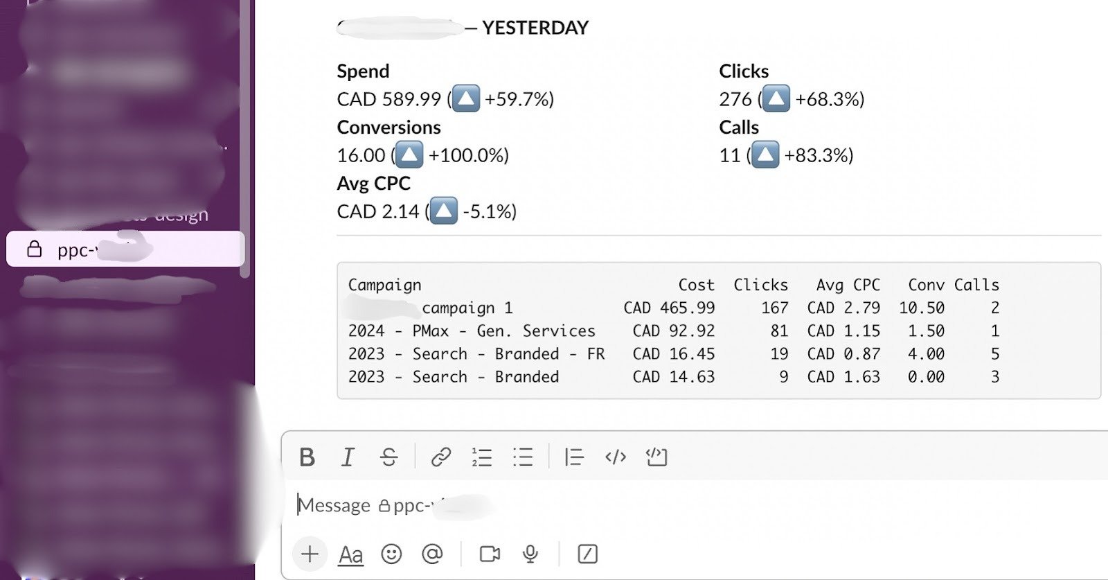 - In this case, we created a dedicated PPC channel where daily performance updates would be delivered.