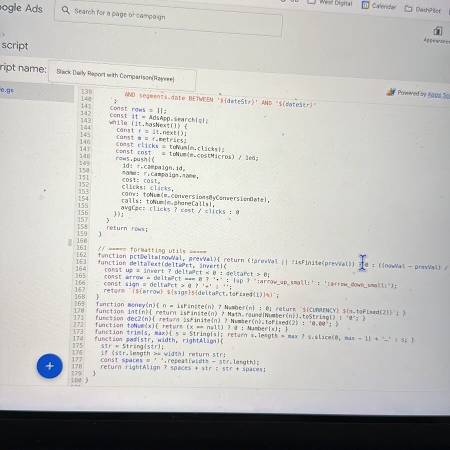 const SLACK_WEBHOOK_URL = 'https://hooks.slack.com/services/...'; - Every time the script runs, it collects campaign data → formats it → sends it as JSON payload to this URL.